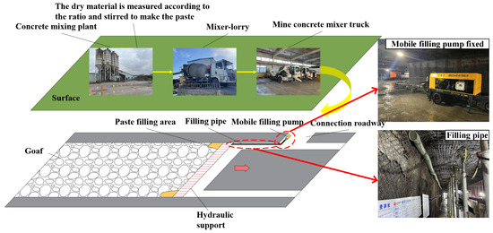 According to the analysis presented earlier, a filling scheme is chosen for the corner-filling operation of the 22,122 comprehensive mining face. This scheme involves filling both corners at intervals of 50 m. The key steps in the inorganic paste filling technology process for the 22,122 working face corner include the preparation and transportation of filling materials, the installation of mobile filling pumps, the laying of pipelines, the pumping of inorganic paste filling slurry, and other critical steps. Taking into account the actual mine conditions, the filling operation for the working face corners is carried out using the surface slurry preparation and tanker transportation method. The specific implementation process is depicted in Figure 17.