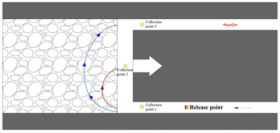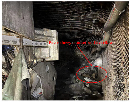 Through the processes of preparing ground slurry, transporting it via a mixer truck, and pumping it through pipelines, the inorganic paste slurry is efficiently pumped to specified locations at the two corners of the working face for filling. Once the filling process is concluded, overflow of the filling slurry at the top of the caved rock layer is observed, and it is depicted in Figure 18. Following two filling sessions, each at a 50 m interval for the two corners of the working face, air leakage before and after the filling is assessed using SF6 gas, employing a system of marking and tracking. SF6 tracing gas is released in the intake airway, and in the presence of air leakage in the working face, the SF6 concentration at measurement points along the path exhibits a decreasing trend. The leakage amount ΔQ between two sampling points can be computed using Equation (5) [35]. The distribution of release points and sampling points is visually represented in Figure 19. Under the measured ventilation rate condition of 1279 m3·min−1 in the working face, the analysis of SF6 concentrations at sampling points 1 and 3 indicates that the air leakage amount ΔQ before filling is 147 m3·min−1. Post-filling, the leakage amount ΔQ decreases to 49 m3·min−1, marking a notable reduction of 66.7%. The majority of post-filling air leakage is directed into the goaf behind the hydraulic support, significantly diminishing air leakage at the two corners of the working face compared to the unfilled state.