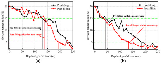 The change in oxygen concentration on both sides of the goaf before and after filling: (a) inlet side; (b) return side.