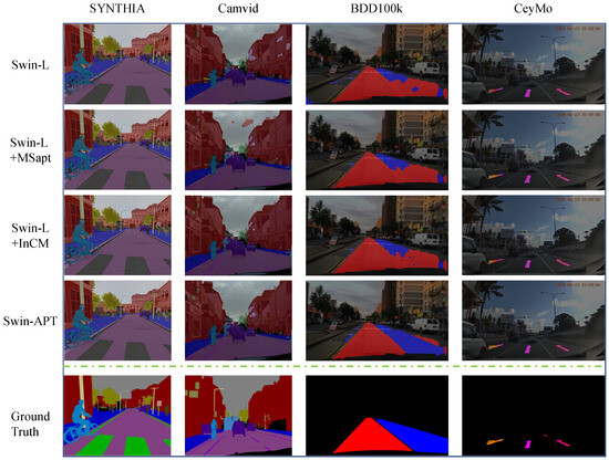 The prediction results of Swin-APT on the BDD100K [21], CamVid [22], SYNTHIA [23], and CeyMo [24] datasets are visualized to demonstrate the performance of the proposed model structure and modules, as illustrated in Figure 4.