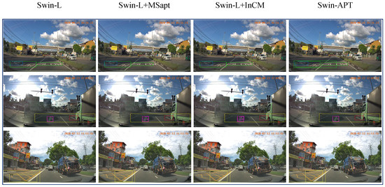 To verify the robustness of the proposed model, the results of Swin-APT on the CeyMo [24] dataset are presented. To ensure consistency with ref. [24], a comparison is made with SSD-MobileNet-v1 [34,35], SSD-Inception-v2 [34,36], Mask-RCNN-Inception-v2 [36,37], and Mask-RCNN-ResNet50 [25,37]. The F1-Score and Macro F1-Score for each category are reported in Table 6.