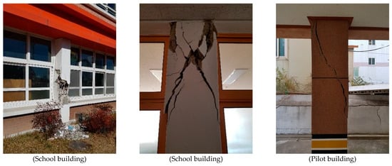 In recent years, large earthquakes, including the 2023 earthquake in Kahramanmaras, Turkey, have been occurring around the world, causing a sharp increase in seismic damage to buildings and human casualties. Seismic damage has also increased in Japan, China, and Taiwan (countries close to the Korean Peninsula) owing to large earthquakes, confirming that Korea can be directly or indirectly affected by earthquakes. The 2016 Gyeongju earthquake and the 2017 Pohang earthquakes showed serious issues in the seismic safety of various facilities in Korea, particularly buildings. They demonstrated that the occurrence of large earthquakes is highly likely and may result in national disasters. During the 2016 Gyeongju earthquake, the scale of the seismic damage to buildings was small except for the seismic damage to non-structural members, including the columns of some buildings (e.g., schools and apartments) located near the epicenter. However, the 2017 Pohang earthquake caused serious seismic damage to school buildings and new pilot structures without seismic reinforcement, as shown in Figure 1 [1]. Among them, the shear failure of reinforced concrete (R/C) columns with insufficient shear reinforcement is currently an important topic for seismic safety design in Korea.