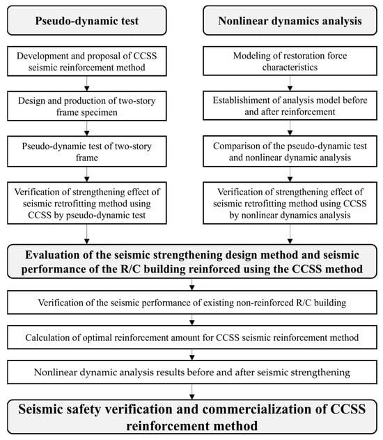 As shown in Figure 2, to examine the seismic safety of the proposed CCSS, two two-story framework specimens were prepared based on an existing R/C building with non-seismic features. A pseudo-dynamic test was then performed on the unreinforced two-story framework specimen and the two-story framework specimen reinforced with CCSS to verify the seismic strengthening effect of applying CCSS to the existing R/C framework, i.e., in terms of load–displacement characteristics and seismic response control capability. The force characteristics were restored based on the pseudo-dynamic test results to allow the nonlinear dynamic analysis of the building reinforced with CCSS (framework specimen) and the restoration force, and the results were compared with the pseudo-dynamic test results. Finally, for the commercialization of CCSS, nonlinear dynamic analysis was conducted on the existing R/C building with non-seismic features reinforced with CCSS. The seismic strengthening effect was then verified by examining the seismic response load, displacement characteristics, and the degree of seismic damage to the members based on the ductility ratio before and after seismic strengthening.