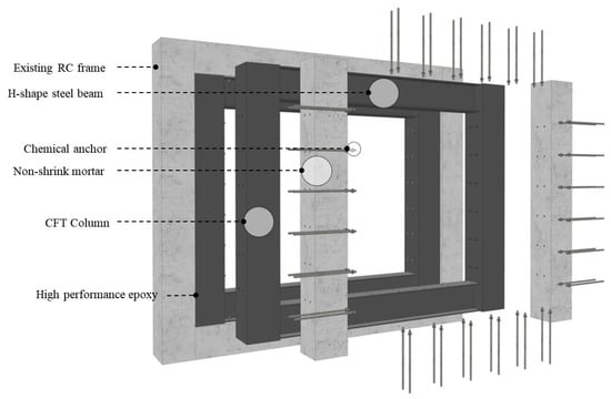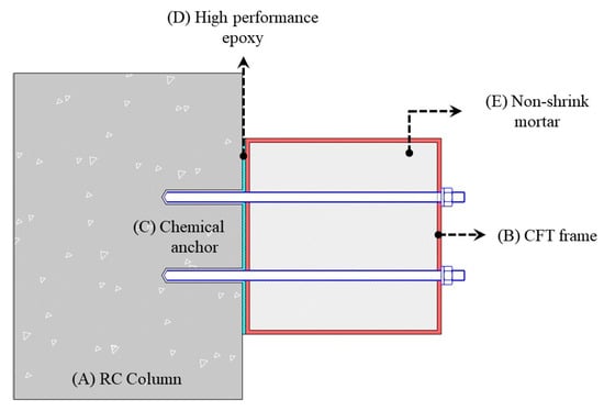 The existing CFT reinforcement method consists of a steel tube by integrating the C-channel into the existing R/C framework through a chemical anchor method and welding another C-channel. In this case, a welding process is added, constructability is reduced, and if the surface of the existing R/C frame is not flat, it is difficult to secure joint integrity between the two C-channels. The proposed CCSS supplements and addresses the shortcomings of the existing chemical anchor method, i.e., the problem of securing joint integrity. It increases strength by directly bonding the reinforcement in the form of a frame to the existing R/C structure, as shown in Figure 3. It innovatively improves the constructability and integrity of the joints between the existing R/C framework and reinforcement. CCSS consists of a reinforcement part, a joint, and a filling part. The reinforcement part is composed of the existing R/C structure and CFT frame, and the joint is composed of chemical anchors and high-performance epoxy. The filling part is composed of non-shrink mortar.