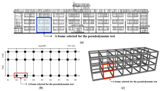 Selected R/C building and frame for the pseudo-dynamic testing: (a) front view; (b) planar view; (c) isometric view.