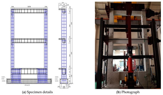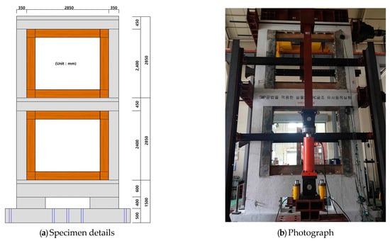 Figure 6 and Figure 7 show the reinforcement details and photographs of the R/C framework of the target building and the specimen reinforced with CCSS. The pseudo-dynamic test was performed on two specimens, including an unreinforced specimen and a CCSS-reinforced specimen for comparison. For the input ground motions used in the pseudo-dynamic test, Hachinohe (EW) exhibited the highest seismic response ductility ratio and was selected based on the research results of Lee [16] to determine the seismic response ductility ratios of the 10 historical seismic waves selected using R/C buildings with less than six stories. The seismic acceleration was normalized to 200, 300, and 400 cm/s2 for the Hachinohe (EW) seismic waves, and 200 cm/s2 (design basis earthquake, DBE) and 300 cm/s2 (maximum considered earthquake, MCE) are the accelerations of two-thirds of the 2400-year return period earthquake and the 2400-year return period earthquake corresponding to seismic zone-1 and ground type S4 in KDS 41 [15], respectively. Additionally, 400 cm/s2 was selected to evaluate the seismic performance of CCSS in the event of a large earthquake. For the axial force, the axial load applied to the two actual columns (framework), i.e., 1000 kN, was divided, and an axial load of 500 kN was applied to each column.