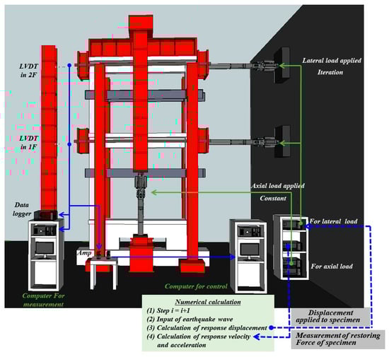 Data conversion was performed using analog to digital or digital to analog converters [19]. In the pseudo-dynamic test, the seismic response was numerically calculated using the closed-loop control system. For the analysis by the control computer and numerical integration, the pseudo-dynamic testing program developed by MTS [20] was used. In the loading test, the seismic response in the next step was calculated using the equation of motion shown in Equation (1), and based on the numerical integration method, the restoration force of the framework specimen owing to the displacement measured using a displacement meter (LVDT) and the seismic response value in the current step, including the input seismic acceleration.