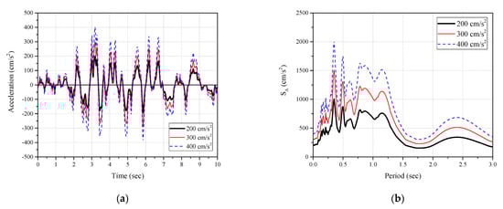 As described in Section 3.2, during the pseudo-dynamic test, the 1000 kN oil jack set was used to apply an axial load (1000 kN) of 500 kN to each of the two actual columns (framework). Figure 9 shows time–acceleration relations of the normalized ground motion accelerations used in the pseudo-dynamic test, respectively, together with their acceleration response spectrum.