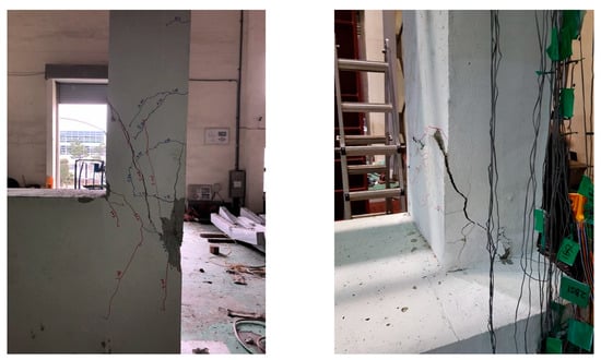 For the PD-FR specimen, initial flexural cracks occurred in the lower part of the column in approximately 2.03 s (6.4 mm) under the seismic wave of 200 cm/s2. The flexural cracks expanded and shear cracks occurred in the upper and lower parts of the column from 2.4 s (17.7 mm). After 2.89 s (38.9 mm), the width of the shear cracks in the lower part of the column increased. At 3.3 s (50.0 mm), severe peeling of concrete began, and the width of shear cracks seriously increased. The maximum displacement occurred at 3.43 s (70.5 mm), and the final collapse was observed as shear failure occurred in the lower part of the framework on the first floor, as shown in Figure 10.