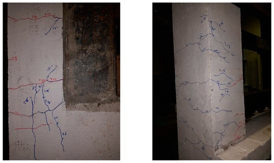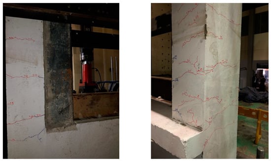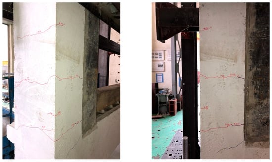 Figure 11 shows the final step (10 s) of the PD-CCSS, which is the specimen reinforced with the proposed CCSS, for the seismic wave of 200 cm/s2. At approximately 2.25 s (displacement: 4.11 mm), slight initial flexural cracks were observed in the lower part of the column. After 3.07 s (displacement: 6.8 mm), the number of flexural cracks increased, but the degree of the cracks was minor. After 4.14 s, when the maximum seismic response was observed (displacement: 10.5 mm), the number of flexural cracks gradually increased, but the crack width was small. Finally, light damage occurred.