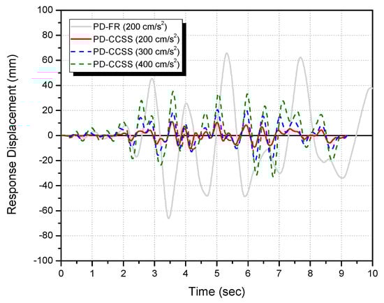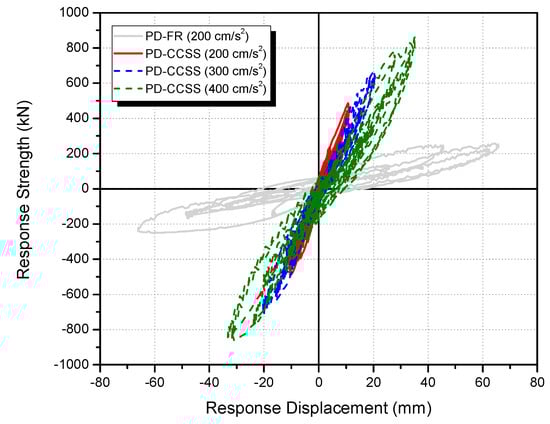Figure 14 shows the seismic response load–displacement curves for the unreinforced specimen (PD-FR) under the seismic wave of 200 cm/s2 and the CCSS-reinforced specimen under 200, 300, and 400 cm/s2. In addition, Figure 15 shows the seismic response displacement–time history curves for the specimens. In Table 5, among the pseudo-dynamic test results for the specimens, the strength and displacement for the input ground motion, which are key factors for seismic safety assessment, were calculated and listed.