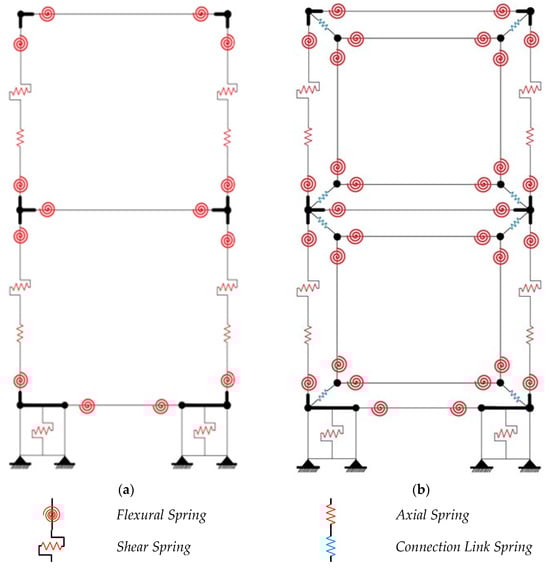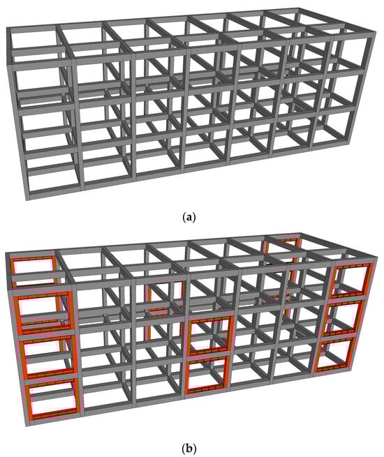 Modeling of the R/C building before and after seismic strengthening: (a) before seismic strengthening and (b) after seismic strengthening (CCSS system).