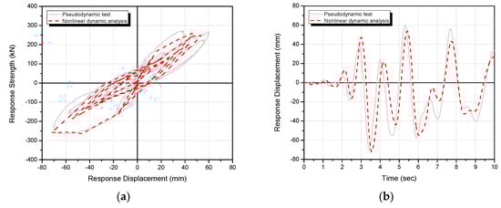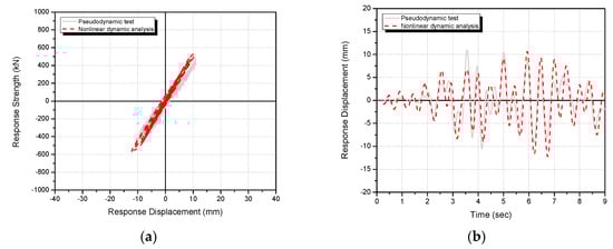 Comparison of the nonlinear dynamic analysis and pseudo-dynamic test results of R/C frame retrofitted with CCSS system (PD-CCSS) (first floor, 300 cm/s2): (a) load–displacement curves and (b) time–displacement history curves.