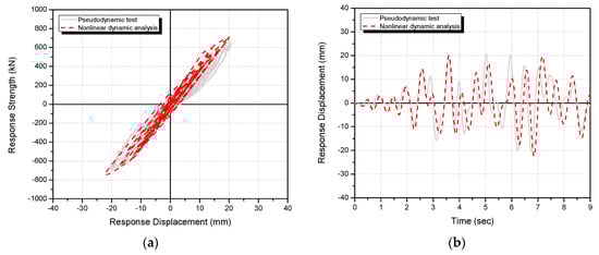 Comparison of the nonlinear dynamic analysis and pseudo-dynamic test results of R/C frame retrofitted with the CCSS system (PD-CCSS) (first floor, 200 cm/s2): (a) load–displacement curves and (b) time–displacement history curves.