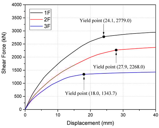 Meanwhile, nonlinear static analysis was conducted to calculate the basic seismic capacity index of the target building before strengthening (Eo), i.e., yield strength (Cy), to determine the volume of CCSS reinforcement required for the building. Figure 21 shows the load–displacement relationship of the existing R/C building obtained through nonlinear static analysis. Table 8 lists the yield displacement, the strength at the time of yielding (yield strength), and the basic seismic capacity index of the target building calculated based on the yield strength. The structure and material properties of the CCSS are the same as the results shown in the specimen overview in Section 3 and those applied in the analysis model in this section, allowing the determination of the required strength of the CCSS for the target building and the number of CCSS units, as shown in Table 9.