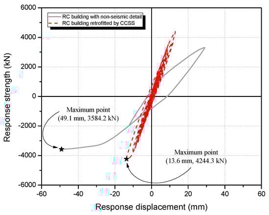 Seismic response load–displacement of non-strengthened buildings and buildings strengthened by CCSS (1F).
