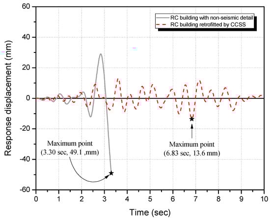 In the case of the target building reinforced with CCSS, shear cracks occurred in the column member at 2.5 s (6.8 mm) under 200 cm/s2. No additional maximum response, however, occurred after showing the maximum seismic response at 6.8 s (13.6 mm), resulting in small seismic damage. Figure 22 shows the load–displacement curves of the unreinforced and CCSS-reinforced buildings on the first floor under 200 cm/s2. Figure 23 shows the time–displacement history curves under the same ground motion. Table 10 shows the maximum response strength, maximum response displacement, and displacement ratio, which are important elements for seismic performance assessment, among the analysis results for the CCSS-reinforced building and unreinforced building under 200 cm/s2.