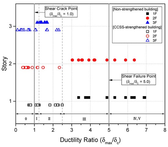 Figure 24 show the ductility ratios () of the column members on each floor with respect to shear deformation in the unreinforced building and CCSS-reinforced building. The ductility ratio in the figures was defined as the ratio of the maximum shear deformation () to the displacement at the time of shear cracking (), which was shown in Equation (13); i.e., . indicates the time of shear cracking, and denotes the time of shear failure. In addition, I, II, III, IV, and V in the figures represent the seismic damage classes described in JBDPA [22] and Maeda, Nakano, and Lee [23].