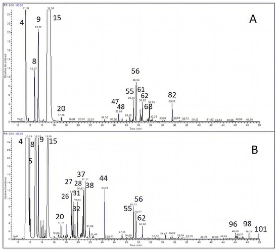 Through chromatographic and spectroscopic techniques, we successfully identified a total of 101 compounds within the EOs isolated from the Greek fir. These compounds constituted 99.4% of the total seed EO composition and 98.3% of the total cone scale EO composition. Chromatograms of both EOs are shown in Figure 1. Additionally, the structures of 13 volatiles in the Greek fir seed EO were confirmed using 1H-NMR spectroscopy.