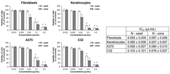 The viability of skin fibroblasts, keratinocytes, and melanoma cells (A375, C32) treated with fir seed and fir cone EOs for 24 h in MTT assay. The data are presented as the mean ± standard deviation of three independent experiments performed in triplicate (* p < 0.05 compared to the 0.1% DMSO-treated group).