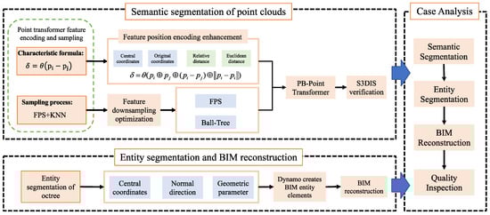 This paper aimed to achieve the automatic semantic segmentation of indoor point cloud data through deep learning, followed by the reconstruction of point cloud data into a BIM. As illustrated in Figure 1, the research initially enhanced the point transformer network through feature position encoding and ball tree sampling to improve the performance of the point cloud semantic segmentation, enabling the computers to analyze objects in a three-dimensional scene. The optimized point cloud semantic segmentation model underwent pre-training and feasibility testing on the S3DIS dataset. Subsequently, the segmented point cloud data were divided into multiple entities using an octree to obtain the geometric and spatial information of target objects in indoor scenes. The obtained geometric and spatial information of entities were used in Revit, through Dynamo, to create BIM three-dimensional reconstructions, mapping the digital world to the physical world. The accuracy of the automatically reconstructed BIM was verified by assessing the average distance error during the fitting process of the BIM with the original point cloud data. The feasibility of the proposed method was validated through the collection of on-site meeting-room point cloud data. The feature-enhanced point transformer and octree algorithm proposed in this study are detailed in the subsequent sections in this chapter.