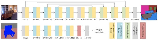 The transformer block integrates a self-attention layer, with the input consisting of a set of feature vectors, x, and associated three-dimensional coordinates, p. Point transformer blocks can facilitate information exchange between local feature vectors and apply the generated new feature vectors as outputs to all data points, adapting to the content of feature vectors and their layout in a three-dimensional space. A point transformer is the main feature aggregation function in a complete 3D point cloud-understanding network, without using a convolution for preprocessing or auxiliary branching. The complete network architecture for the semantic segmentation is shown in Figure 4.