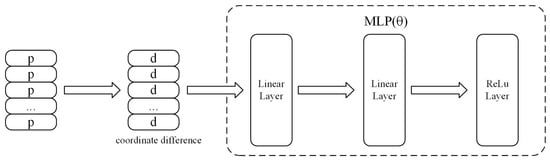 Subset is the local neighborhood of . The mapping function for point transformer is an MLP containing two linear layers and an ReLU nonlinear function. In this way, the point transformer layer is able to perform a local feature transformation and self-attention calculation on each data point and its neighborhood to better capture the correlation between the data points. Figure 2 shows the structure of the point transformer layer.