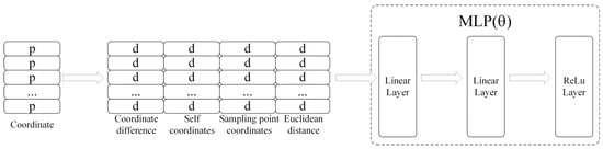 For a single point, the corresponding MLP processing content changed in the point transformer layer after a local spatial information encoding enhancement. The single-point feature acquisition operation in the original local space can be represented by Formula (2), while the improved single-point information encoding can be represented by Formula (2):
