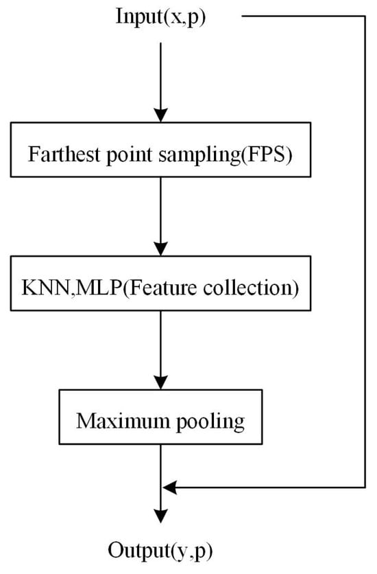 The transition down layer in the point transformer network performs downsampling operations, and the module is shown in Figure 7. However, KNN sampling is usually used to obtain a set of neighboring points around a point when processing point clouds. Due to differences in the density and sampling methods of point clouds, the number of neighboring points around each point may be very different, resulting in different sizes of local regions being used for calculations [53]. This makes it difficult for the network to converge, as local regions of different sizes cannot receive appropriate weight adjustments. Therefore, it is necessary to adopt a more concise and accurate method for feature downsampling.