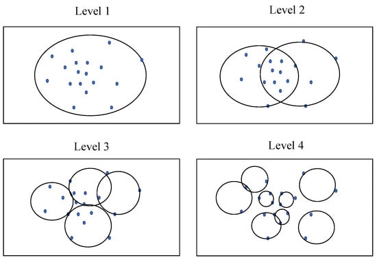 The ball tree algorithm is a tree-like structure used for performing a rapid nearest neighbor search, and it ensures a fixed local neighborhood, which is beneficial for learning local features [19]. The construction of the ball tree involves two steps: computing the spherical range and partitioning the data points. In each node, the spherical range for all data points is computed, and the two farthest points are selected as splitting points. Then, the data points are divided into left and right subsets based on these splitting points, and corresponding child nodes are created. This process continues until a node contains only one or less K data points. The abovementioned process is illustrated in Figure 9.