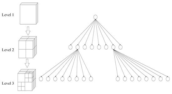 The octree algorithm is a commonly used tree-like data structure for managing three-dimensional data [54]. The fundamental idea behind octrees is to partition three-dimensional space into a series of cubes (also known as volume elements) and build a tree-like structure based on this division. Each node in the octree represents a volume element in the form of a cubic region, and every node has eight child nodes. The combined volume of these eight child nodes is equal to the volume of their parent node, as illustrated in Figure 10. The octree algorithm exhibits significant advantages in handling high-dimensional data and adaptability [55]. It finds wide applications in various fields of three-dimensional computer graphics, such as ray tracing, collision detection, 3D modeling, and more [56]. The processes of creating an octree are as follows: