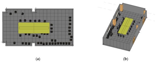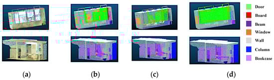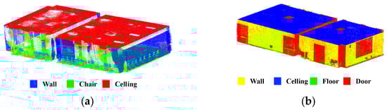 This research focused on collecting the data from a conference room and performing a semantic segmentation using a feature-enhanced point transformer. The algorithmic segmentation results are shown in Figure 14a, while the manually annotated results are shown in Figure 14b. In some regions where certain categories were closely related, such as windows, wooden boards, and walls, the algorithmic segmentation often misclassified windows as wooden boards or walls. Additionally, in areas where chairs and walls were close to each other, the model indirectly segmented a portion of the chair’s point cloud as part of the wall. These issues indicate that there is still room for improvement in achieving accurate local semantic segmentation results for point clouds. Overall, the results of the automatic segmentation can be substituted for manual segmentation results; although, improvements in local semantic segmentation’s accuracy are needed.