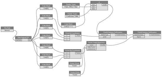 Dynamo is an open source visual programming platform based on the Autodesk Revit API, designed to assist users in customizing BIM workflows. In contrast to traditional text-based programming languages, visual programming languages use graphical elements instead of textual expressions, enabling users to write scripts and define logic through graphical operations [58]. In this section, Autodesk Dynamo was employed as a visual scripting tool for importing Excel data and generating Revit models of tables and chairs in the indoor scene. The Revit models for the tables and chairs needed to be predefined. The table’s Revit model was adjusted based on the calculated length, width, and height from the entity segmentation, while the chair was replaced with a standard conference chair model. The Dynamo workflow is illustrated in Figure 18.