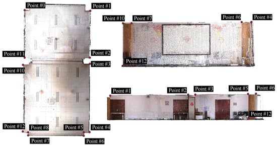 The research compared the collected point cloud data with the constructed BIM to investigate the feasibility of the automated BIM reconstruction method. Twelve key points were selected from various perspectives, including the top, side, and front views of the original point cloud data, as shown in Figure 20. A comparison was performed between these key points, and the deviation between the original point cloud data and BIM was calculated to assess the consistency of the BIM created in the study. The research assumed that the distances captured in the actual point cloud data were equal to the design distances. The distances between the points in the figure presented above were calculated, and their deviations from the constructed BIM model are presented in Table 4.