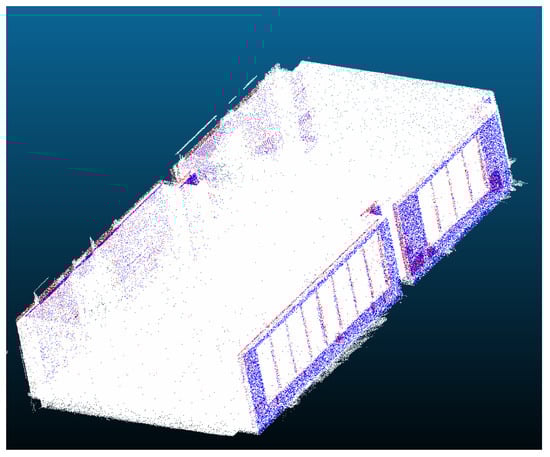 From the table, it can be observed that the errors in the BIM model reconstruction results are mostly within 2 mm, with the largest deviation occurring between Points #6 and #7, reaching 6.777 mm. This was due to the presence of pipeline obstructions in the corners during the data collection process, leading to voids in the original data. During the BIM reconstruction process, these voids resulted in certain inaccuracies when aligning with the original point cloud data. Upon analyzing the areas with larger errors, it was found that this deviation was caused by the thickness of certain wall decorations during the finishing process, leading to discrepancies in the design. To provide a more intuitive representation of the deviation between the BIM model and the actual point cloud, this study used the ICP algorithm to visualize the errors, as shown in Figure 21.