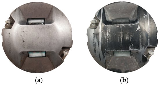 The in-pavement navigation lamps are equipped with light sources that have a limited lifetime [5,6]. The decrease in the luminous efficiency of lamps is also caused by contamination of the prisms (e.g., by sticking rubber from aircraft tires). It is also influenced by weather conditions because heavy snowfall requires the usage of snowplows, which, with their metal brushes, damage lamp housings and chips and scratch their prisms (Figure 1).