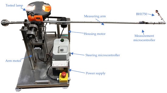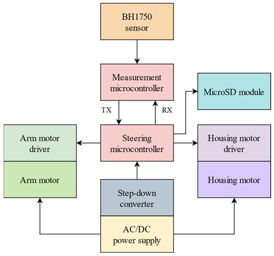 The distribution of luminous intensity was measured using a specially prepared device. The device consists of a turntable to which the tested lamp is attached and a rotating arm with a light sensor attached at the end. It works by taking a series of measurements for different angular positions of the table and the arm, which result in the values of luminous intensity at points forming a grid on the spherical surface around the light source. The block scheme of the proposed device for automatic measurements of the airport lamps is presented in Figure 3.