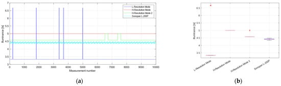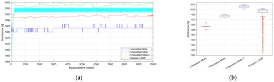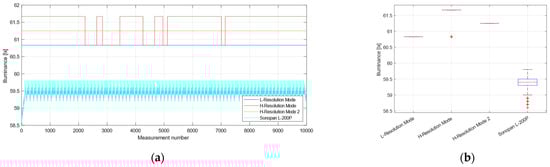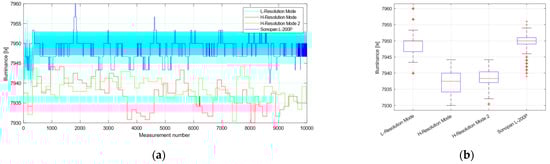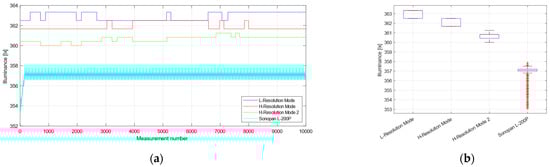 An important aspect in the context of measuring the photometric characteristics of airport lamps is the repeatability of the obtained measurement results. The navigation lighting lamps operate in five different modes, differing from each other in the illuminance level, which is regulated by changes in the current intensity of the power supply system; the exact values are presented in Section 5. Taking these conditions into account, an experiment was carried out consisting of making a series of 10,000 measurements using the GY-302 module with a BH1750 sensor for the brand new touchdown zone lamp IDM 4671, changing its power modes and changing the illuminance sensor operating modes. To ensure that the obtained values of illuminance are correct, a Sonopan L-200P certified luxmeter measurement was also taken [24]. The photometric distance was assumed to be consistent with the length of the goniometer arm, which is 1 m. Figure 6a, Figure 7a, Figure 8a, Figure 9a and Figure 10a show the measured illuminance values and statistical box plots in Figure 6b, Figure 7b, Figure 8b, Figure 9b and Figure 10b.