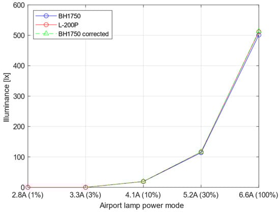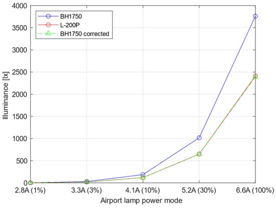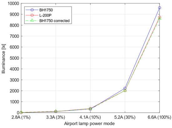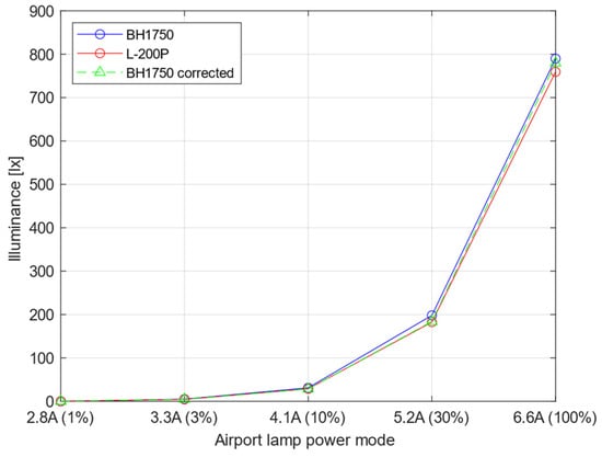 The analysis of results presented in Table 2 shows that the spectral characteristic [23] of the BH1750 sensor (ROHM Co., Ltd.: Kyoto, Japan) has an influence on the measurement value, and after introducing mathematical correction, it can be similar to the measurement obtained from the professionally certified Sonopan L-200P luxmeter (Sonopan, Louiseville, QC, Canada) [24] (Figure 11).