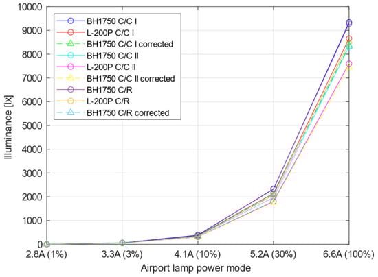 Digital illuminance sensors that enable a relatively simple construction of devices have sufficient measuring range and accuracy. Experiments conducted for standardised airport lamps’ power supply thresholds allowed us to compare the BH1750 sensor with the reference Sonopan L-200P luxmeter. The aspect of measurement stability depending on the BH1750 work mode was investigated. Due to the fact that airport lamps operate in high ranges of illuminance it was possible to choose L-Resolution Mode that brings the advantage of faster data acquisition time.