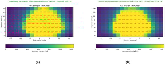 After the lamps were refurbished, consisting of the replacement of prisms, cleaning or replacement of the housing, replacement of halogen light sources, and sealing, the photometric characteristics were re-examined. The test results showed that all the in-pavement navigation lighting lamps met the required standards, significantly exceeding the prescribed minima. Figure 25, Figure 26 and Figure 27 are heat maps of photometric characteristics for luminaires with the same serial numbers as those shown in Figure 22, Figure 23 and Figure 24.