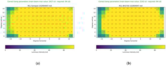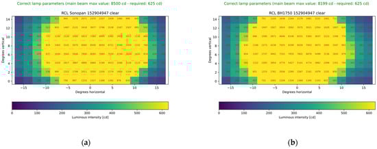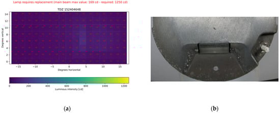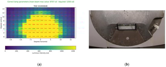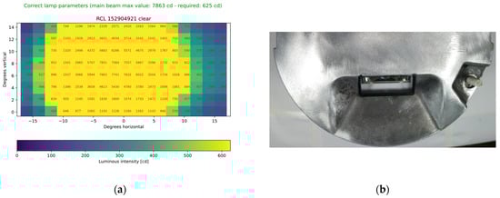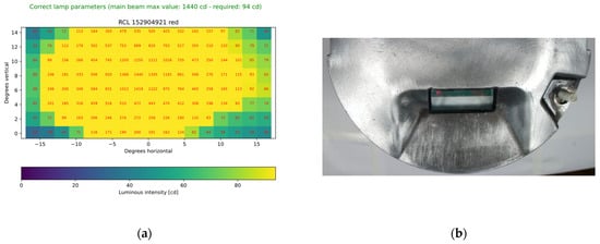 Luminous intensity measurements of refurbished RCL clear lamp: (a) heatmap chart; (b) lamp view.
