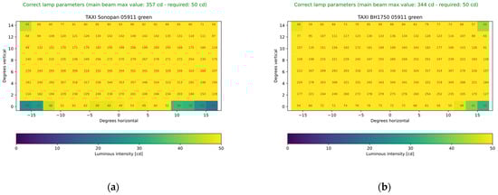 Luminous intensity measurements of TAXI green lamp: (a) Sonopan L-200P, (b) BH1750.
