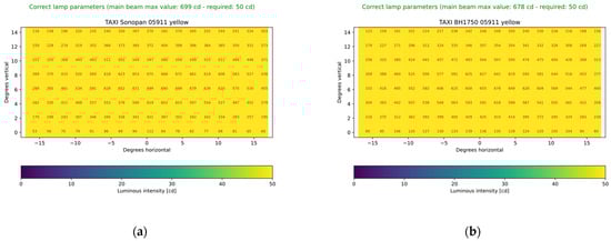 Luminous intensity measurements of TAXI yellow lamp: (a) Sonopan L-200P, (b) BH1750.