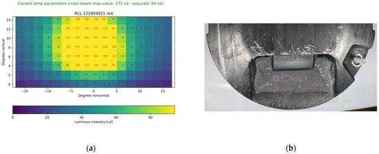 Luminous intensity measurements of used RCL clear lamp: (a) heatmap chart; (b) lamp view.