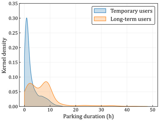 Based on the recorded parking arrival and departure times, the parking duration can be calculated. To enhance data quality, parking durations shorter than 0.25 h were considered outliers and removed. Several statistical indicators (i.e., mean, median, standard deviation) were employed to briefly analyze the statistical characteristics. The mean, median, and standard deviation for both the temporary users and long-term users are as follows: 2.683, 1.390, and 2.845 h for temporary users, and 7.352, 6.549, and 7.077 h for long-term users. It is evident that the parking duration of long-term users exceeds that of temporary users. Moreover, Figure 2 illustrates the kernel density function of the parking duration. It can be observed that the parking duration of temporary users follows a unimodal distribution, with the majority of parking duration samples falling within the range of 0 to 5 h. Conversely, the parking duration of long-term users exhibits a bimodal distribution, with parking duration samples spanning from 0 to 12 h.