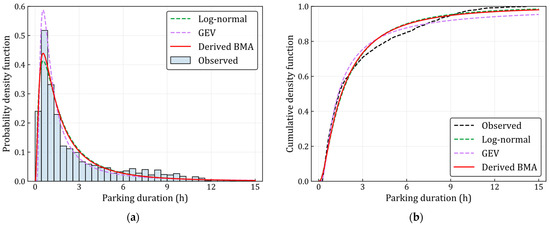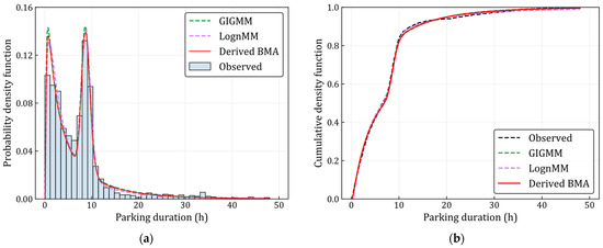For the parking duration of temporary users, the log-normal distribution shows the best performance in describing the characteristics of parking duration, since it has the highest posterior model probability with a value of 0.910. However, normal distribution displays the worst fitting performance in the parking duration modeling, attributable to an exceptionally low posterior model probability (i.e., below 0.001), the minimum log-likelihood (with a value of −3710.85), and the maximum AIC and BIC values (measuring 7425.69 and 7436.20, respectively). Furthermore, GEV distribution is a viable option for characterizing parking duration features, exhibiting a posterior model probability of 0.090. According to the parking duration of long-term users, GIGMM obtains the maximum posterior model probability with a value of 0.897, indicating that GIGMM is the best model for depicting the characteristics of parking duration. In addition, it is noteworthy that multiple models exhibit substantial posterior model probabilities. The LognMM model, with a posterior model probability of 0.103, is also a suitable choice for modeling parking duration among long-term users. This indicates that both GIGMM and LognMM are viable options for modeling parking duration data (the values of posterior model probability are both larger than 0.001). These models illustrate that there is model uncertainty in describing parking duration distribution among different user groups.