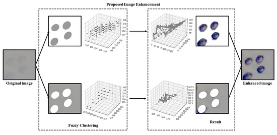Image enhancement plays a vital role in improving the image quality of living cells acquired from the microscope by emphasizing key features, reducing secondary characteristics, enriching information, and enhancing details. Fuzzy Automatic Contrast Enhancement (FACE) [5] is applied as a contrast enhancement technique for microscopic images of living cells. FACE changes the original pixel distribution to a less congested one while maintaining smoothness in the color distribution to prevent artifacts in living cell images. This approach utilizes a universal contrast enhancement variable (UCEV) to achieve better contrast enhancement automatically, without manually feeding parameters. The FACE technique utilizes a Fuzzy C-Means (FCM) method to classify pixels with similar colors together using clustering. The maximization of image entropy was automatically achieved through the use of UCEV. By utilizing FCM and UCEV, the image contrast was enhanced with good accuracy, without any artifacts or noise. The schematic diagram for FACE image enhancement is illustrated in Figure 2.