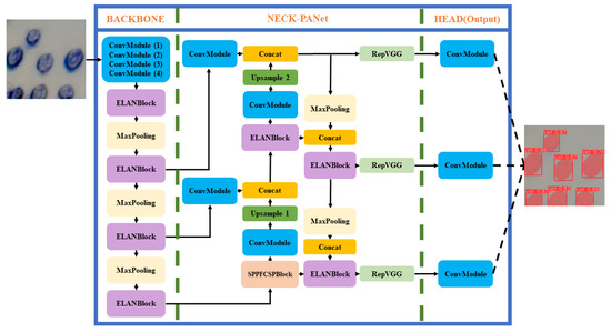 Individual living cell image recognition and localization is determined by finding the outline and coordinates of a cell. A state-of-the-art deep learning algorithm YOLOv7 [6] is used, which performs the real-time process of recognition and localization of cell contours and centers. Its architecture, as illustrated in Figure 4, consists of a backbone network, neck network, and head network. The backbone network extracts features from the input image, while the neck and head networks refine the feature maps to generate object recognition of living cells. The algorithm utilizes anchor-based object detection, where anchors are predefined bounding boxes of various sizes and shapes. This enables the network to detect living cells of different shapes and sizes accurately. YOLOv7 also uses a feature pyramid network (FPN) that extracts multi-scale features from the input image. The FPN combines feature maps of different resolutions to generate a feature pyramid, which enables the network to detect living cells at different scales. The network detects living cells in two stages using anchor boxes and the predicted objectness score. YOLOv7 learns to predict the bounding boxes and class labels of living cells from ground truth annotations during training, making it highly advanced and efficient for detecting living cells.