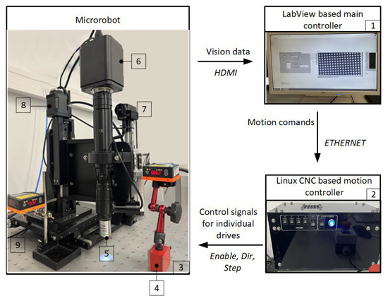 Micro-positioning system. 1—PC; 2—micro computer (motion controller); 3—antivibration table; 4—laser distance sensors LAT 61 K 30/8 IUPN; 5—objective; 6—camera; 7—micro-manipulation tool drive; 8—camera drive; 9—stage with X and Y drives.
